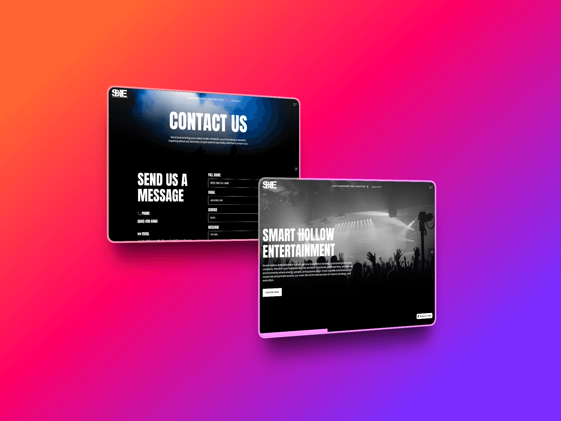 The Smart Hollow website, designed and built on Framer, delivers a clean, modern, and fully responsive platform for showcasing events, visuals, and the brand’s nightlife identity. The project created a cohesive digital presence by combining bold imagery, intuitive navigation, and consistent branding across devices, helping Smart Hollow better engage audiences, promote events, and strengthen its online presence.